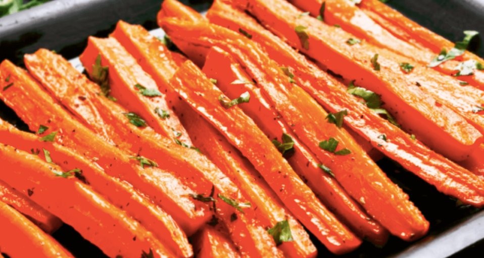 - Mix the oil with salt, pepper and the crushed garlic. Toss the carrots well with the seasoned oil and transfer them to a baking tray lined with baking paper.