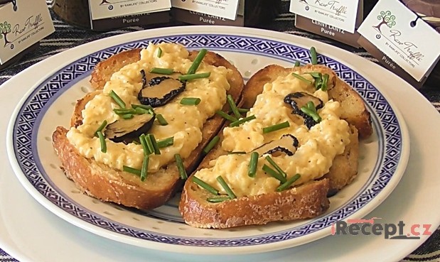 Delicious gourmet scrambled eggs – in butter and cream, scented with stirred purée of black truffle and garnished with truffle slices – all on toast made from homemade sourdough bread, fried in butter. The cooking procedure is given in detail in the video recipe.