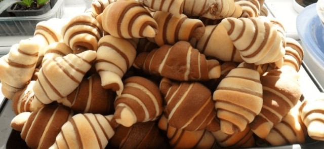 • Shaping the rolls: Divide both doughs into smaller equally sized pieces. Roll each piece into a circle. Place one white and one brown circle on top of each other, press them together slightly and cut into triangles. Roll the triangles from the wider side toward the tip and shape into rolls.