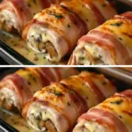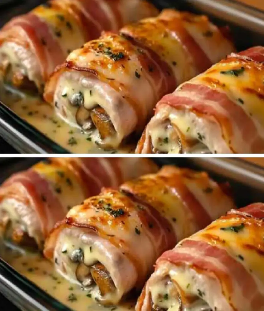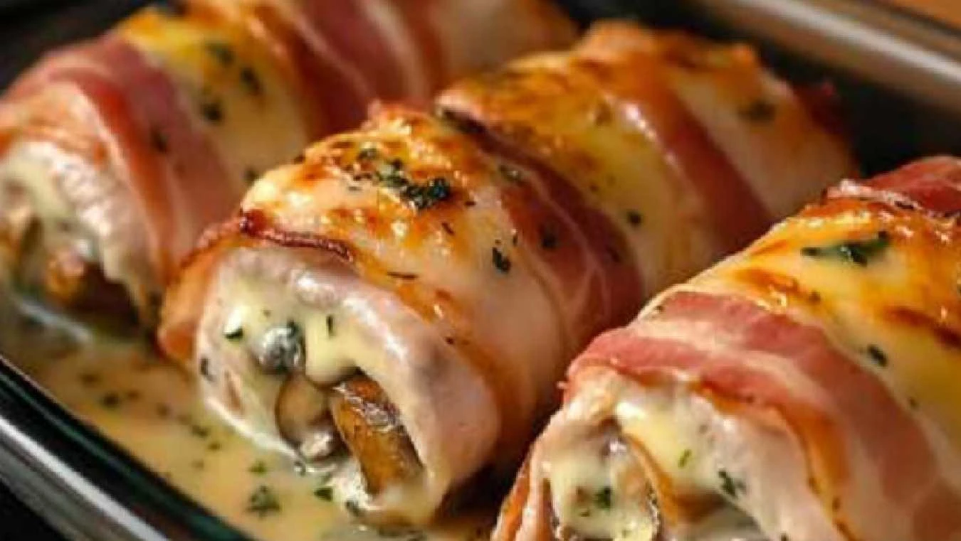 Stuffed chicken rolls in bacon with mushrooms and cheese: an addictive one-pan dinner