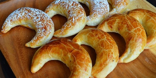 • Shaping the crescents: Divide the dough into the same number of pieces as you have fillings (about 24 pieces). Roll each piece of dough on a floured surface into a thin disc (less than 2 mm). Place a piece of filling on the disc and wrap the dough into a crescent shape. Each roll should have tapered ends.