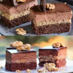 - Preparation of the base Separate the eggs into whites and yolks. Beat the yolks with the sugar until pale and foamy. Add the softened butter and whisk. Fold in the sifted flour, cocoa, baking powder and walnuts. Finally, gently fold in the beaten egg whites with a pinch of salt. Spread the batter on a baking sheet lined with parchment paper (approx. 30×40 cm). Bake for 14–17 minutes at 180 °C. Check with a skewer whether the base is done.