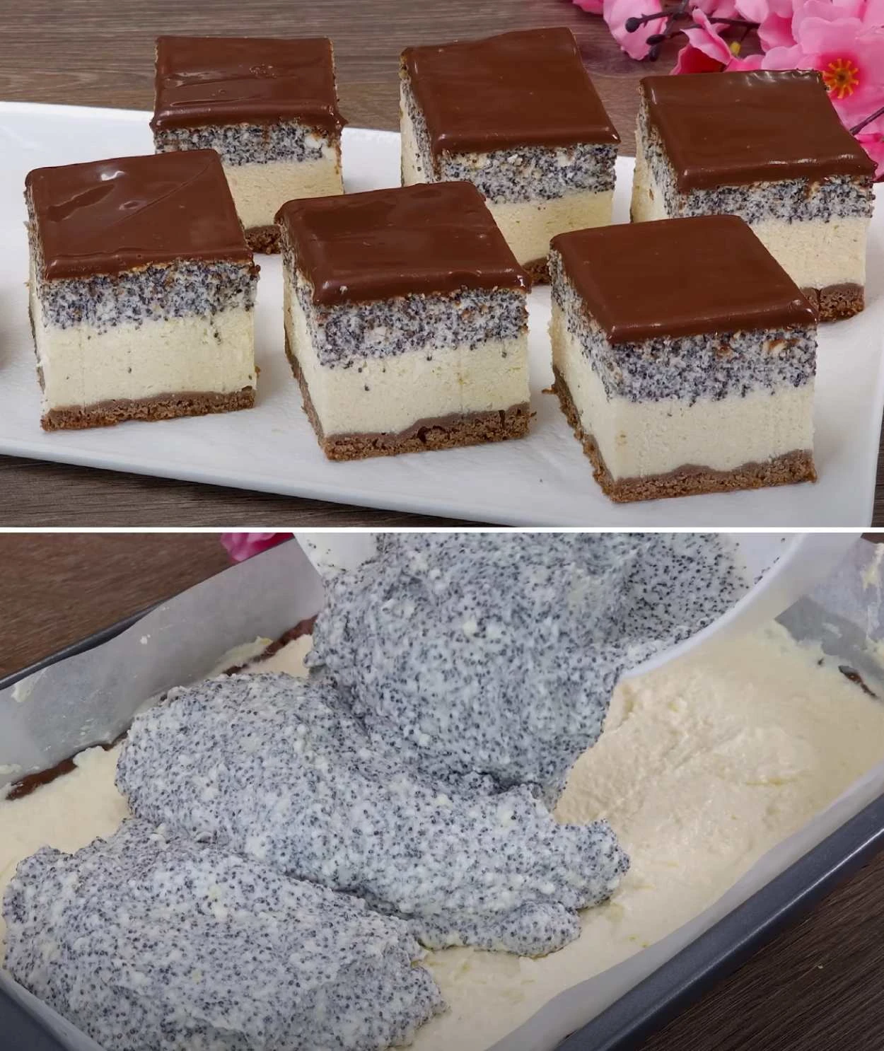 • Assembly and baking: Spread most of the plain quark filling over the cocoa dough. Layer the poppy-quark mixture on top and smooth the surface. Bake in a preheated oven at 180 °C for about 60–75 minutes, until the center springs back and a skewer comes out almost dry. Let cool completely in the pan.