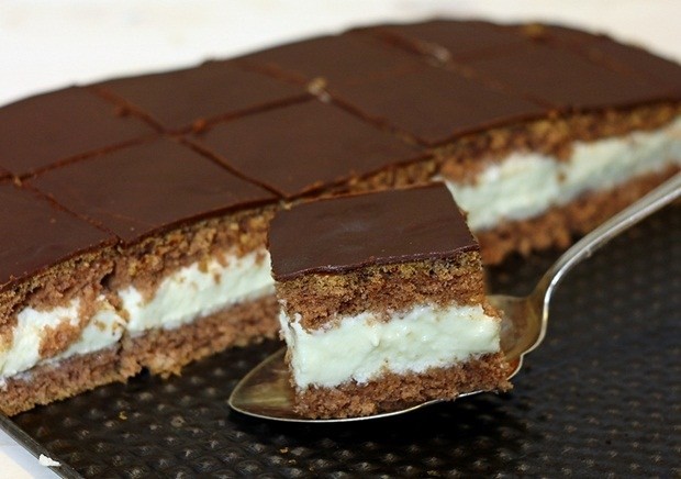 - Preparation of the dough: Separate the yolks from the whites. Whip the egg whites to stiff peaks, gradually add the sugar and continue whipping. Add the yolks one at a time and mix well. Gently fold the flour, cocoa and baking powder into the mixture. Pour the batter into a greased and floured baking pan measuring 25 × 25 cm. Bake in a preheated oven at 200 °C for about 15–20 minutes. Let the baked cake cool and cut it horizontally into two equal layers.