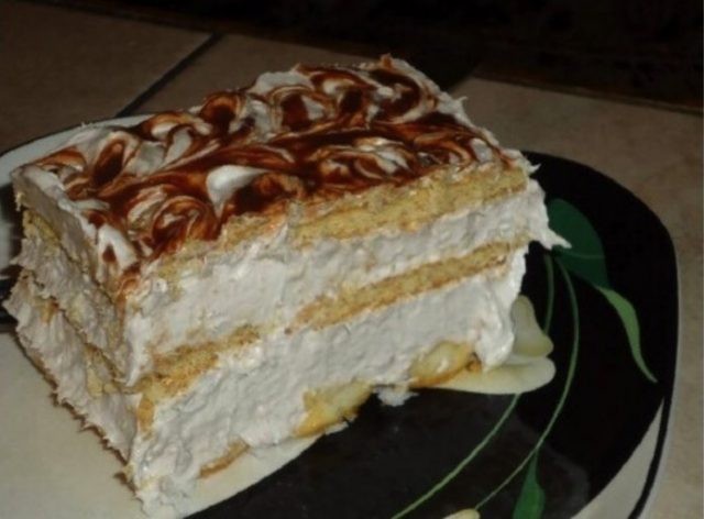 • Layering the cake: Line the bottom of the cake pan with sponge biscuits, which you should lightly soak in milk beforehand. Spread the first third of the whipped cream over the biscuits. Place a layer of butter cookies over the cream layer, which should also be soaked in milk. Spread another layer of cream over the cookies. Place butter cookies on the second layer of cream again and cover them with the remaining cream.