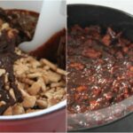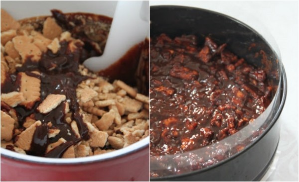 - Preparation of the cake base: In a saucepan, mix the condensed milk with the cream and heat over low heat. Add the chocolate and stir until it melts and a smooth mixture forms. Once the mixture begins to simmer lightly, remove it from the heat and break the butter cookies into it. Mix thoroughly so that all the cookies are coated with the chocolate mixture. Prepare a round cake pan and press the cookie mixture into the bottom. Smooth the surface with a spoon.