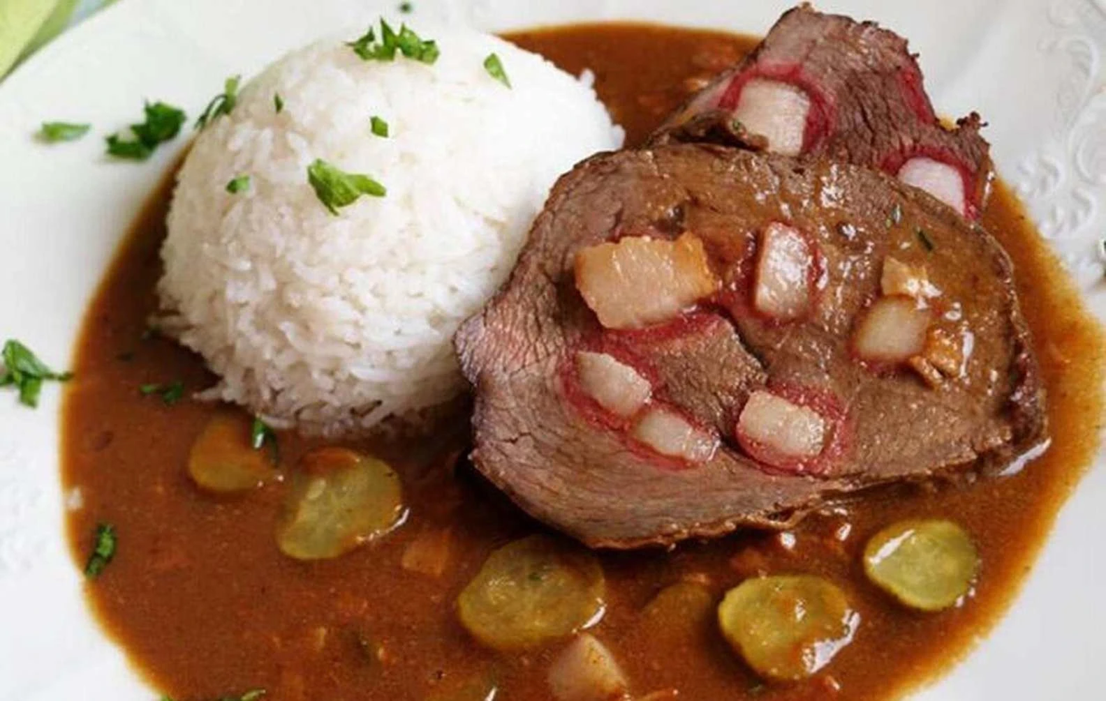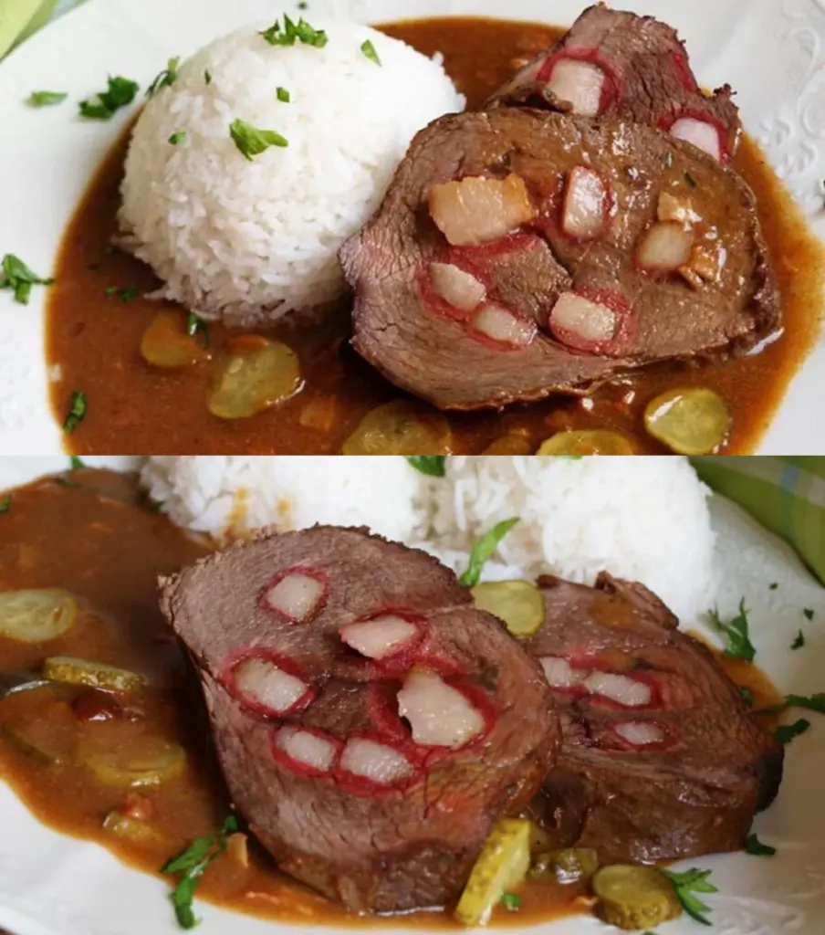Znojmo roast according to Kluků v akci is a safe bet. The base relies on patiently searing the meat and onions, a carefully mixed roux and final seasoning with mustard and pickles. The result is a rich, mildly spicy sauce and juicy beef that tastes just as great the next day after resting.