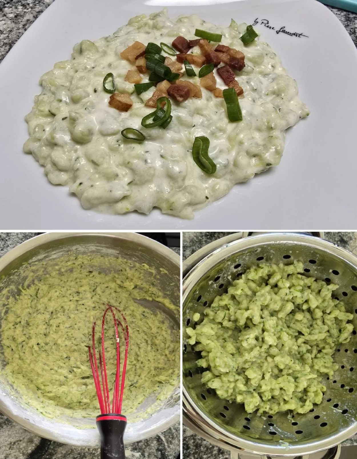 Zucchini halušky with bryndza and bacon are a great alternative to traditional potato halušky. The light zucchini batter refreshes the flavor and pairs wonderfully with rich bryndza and crispy bacon. Serve warm, ideally with a fresh herb salad, and enjoy the simple yet rich tastes of summer.