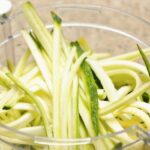 • Cut it lengthwise in half and then we will not cut it with a knife but with a vegetable peeler. Using it, gradually separate thin strips of zucchini until you use up both pieces.