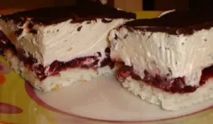 Heavenly cake with cherries, a coconut base and chocolate glaze