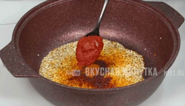 Na oleji si osmažíme nakrájenou cibulku do zlatova. Přidejte červenou papriku, chilli a rajčatový protlak.
