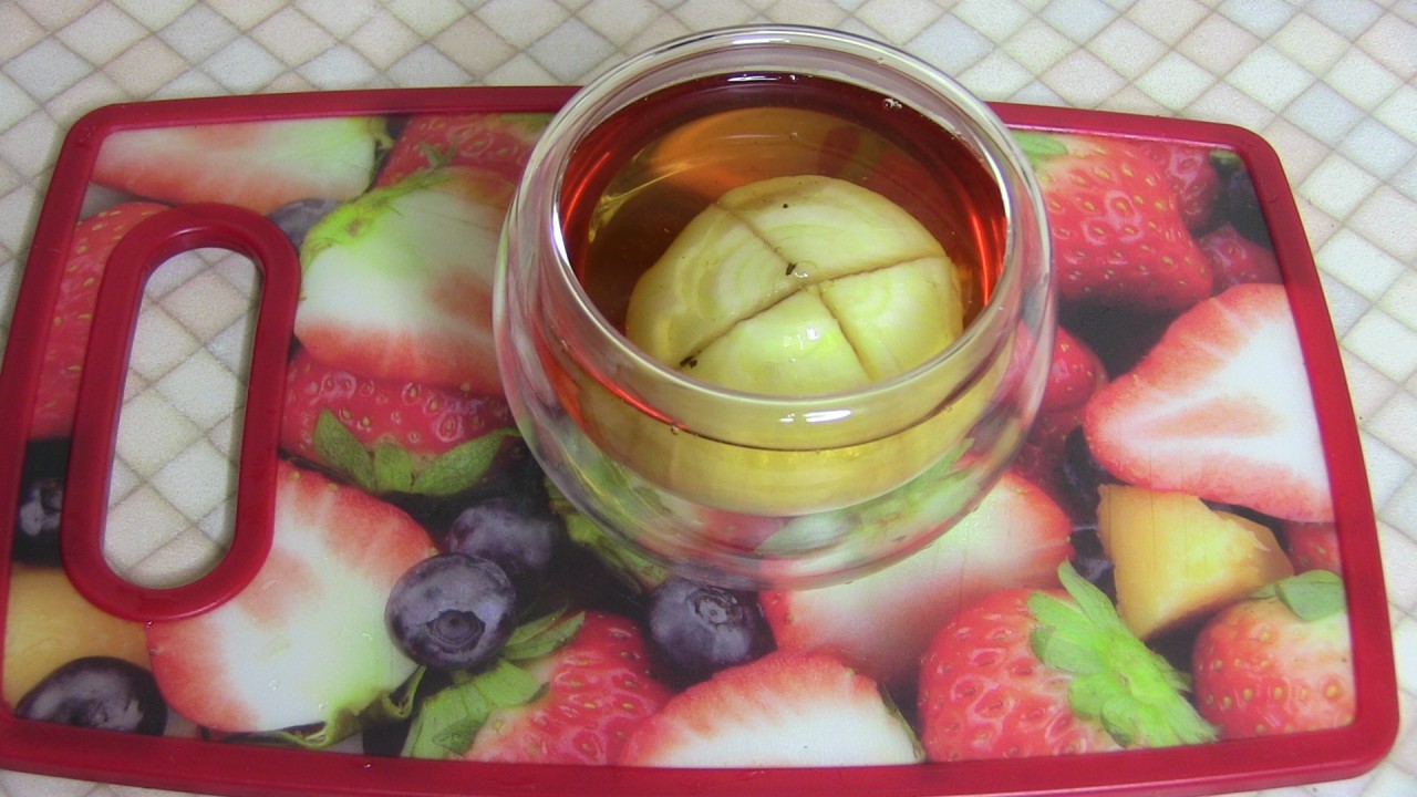 2. Steeping: Place the onion into a mug, add tea leaves or a tea bag with your favorite tea and pour hot water over it.