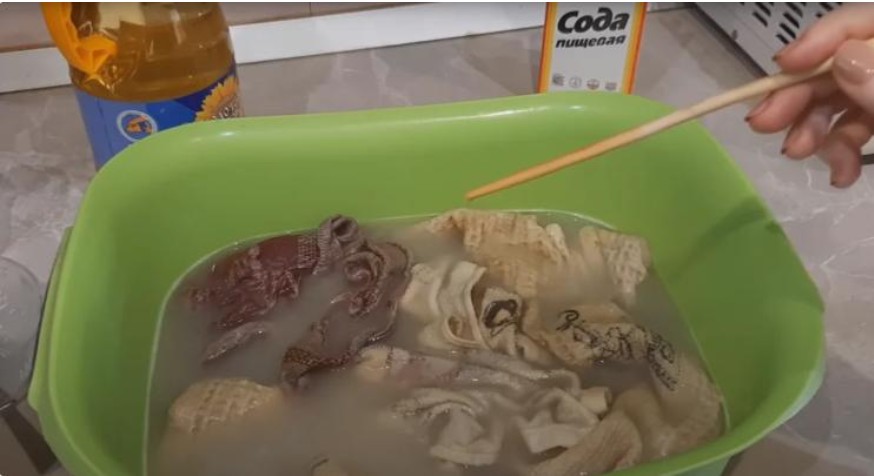 Take a basin and fill it with three liters of hot water. Then add the laundry detergent, baking soda, bleach (you can buy it for 30 crowns at the drugstore) and the sunflower oil. Stir with an old wooden spoon. You may find the use of sunflower oil for whitening and properly cleaning stains rather incomprehensible, but trust that this method proves to be very effective. Thanks to the oil, greasy stains on the fabric will dissolve. Once the ingredients are mixed, place the towels or dishcloths into the basin. Now leave the textiles in the basin so that all dirt can dissolve. You can leave the submerged cloths overnight or at least for five hours. Then pour the towels or cloths into the bathtub, rinse them lightly with the shower and put them into the washing machine and set it to a 60 °C cycle. After washing, put the towels or cloths into the dryer — they’ll be wonderfully soft. If you don’t have a dryer, place the textiles in the sun. The towels or cloths will be wonderfully clean, and moreover will smell fresh.