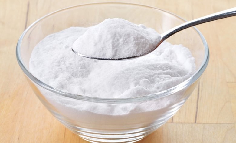 I soaked a medium-stiff-bristled brush and sprinkled baking powder onto the grout.