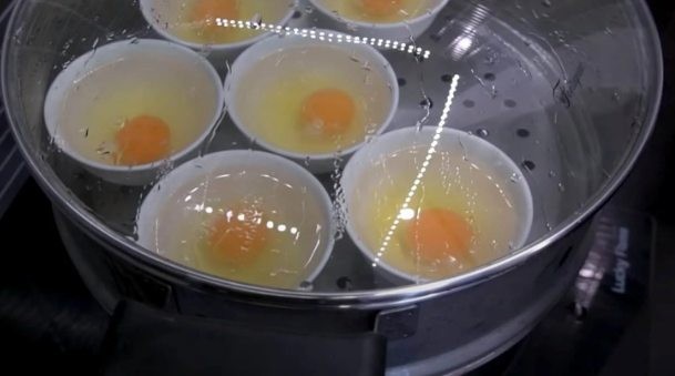 • Crack one egg into each bowl. Place the bowls in the steaming basket and set it over a pot of boiling water.