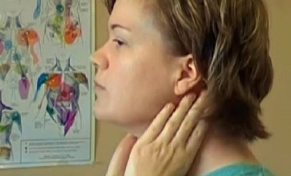 Place both palms on both sides of the neck under the ears. Press downward toward the shoulders. Repeat at least 50 times and you will feel the lymph flowing down from the nodes behind the ears.