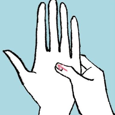 Press this point with your thumb vertically toward the base of the index finger. As you exhale through your mouth, increase the pressure for 5 seconds, then inhale through your nose for 5 seconds and slowly relax. Repeat this procedure 5 times. This technique will help release tension and calm the nervous system.