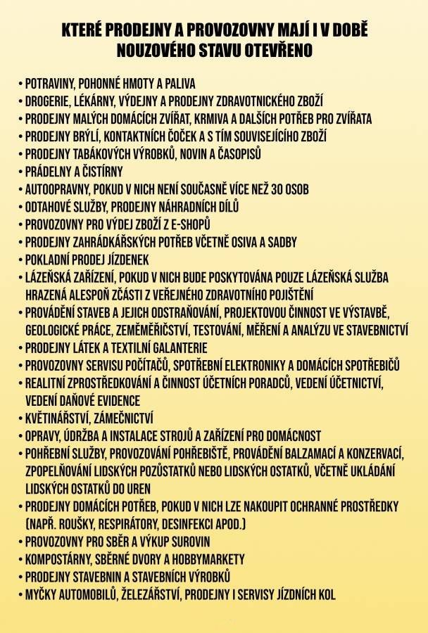 The state of emergency in the Czech Republic has been in effect since March 12, when shops such as drugstores, pharmacies, opticians, pet stores, newsagents, petrol stations and grocery stores may be open.