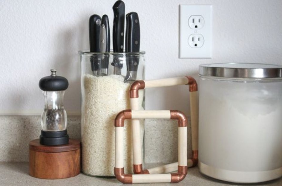 All you will need is a vertical transparent container and rice. Rice perfectly absorbs moisture and because of that your knives won’t rust or mold during storage, as can sometimes happen with wooden racks.