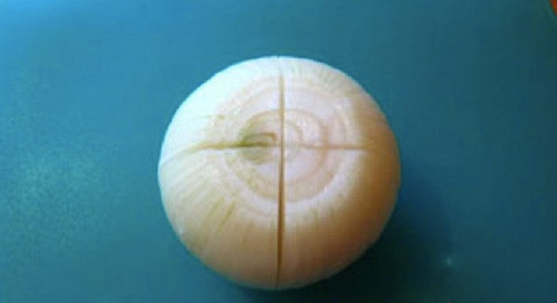Cut the onion into 4 equal parts, as you can see in the picture. Only cut the onion so that it still holds together.