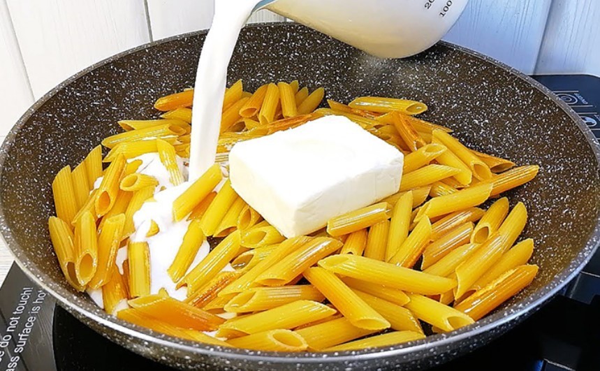 Heat a little olive oil and put the pasta into it. We recommend Penne, but if you prefer another kind, use that. The pasta is placed into the oil uncooked, that is, hard. You can also use whole-grain pasta or corn pasta. You just need to watch the pasta and, if the milk boils away, add a little more. Whole-grain pasta cooks longer. Fry the pasta in the oil for about two minutes.