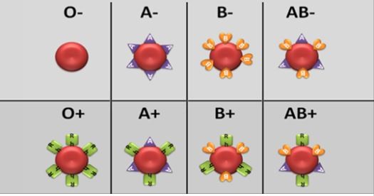 Blood types are further distinguished by the Rh factor. It is caused by a group of about 40 antigens, of which the most important are the antigens C, c, D, E and e. The strongest is the D antigen. If it is present on the surface of red blood cells, the blood is designated Rh+. In the opposite case it is labeled Rh-. People who do not have the D antigen in their blood (that is, people with Rh-) cannot receive blood from people with Rh+, because their body would form antibodies against the antigen and would not accept the blood.